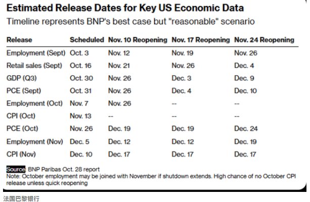 如果僵局持续到11月24日,数据发布可能延续到12月中旬,GDP(第三季度)数据将在12月9日左右发布,PCE(9月)数据在12月10日发布。
