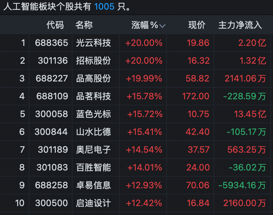 市场热点方面,人工智能概念股午后走强,板块指数放量涨逾2%。品高股份连续第2日20%涨停,股价创历史新高;光云科技、招标股份等亦20cm封板;蓝色光标、百胜智能、三六零等逾30股涨停或涨超10%。