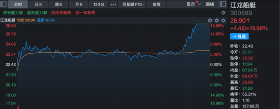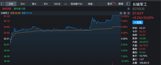 军贸概念、航海装备等板块尾盘也出现加速上扬的走势,航天装备、军工信息化、大飞机、卫星导航等板块午后涨幅也进一步扩大。江龙船艇在距离收盘不到20分钟的时候强势20%涨停;久之洋、航天环宇等亦20%涨停;国科军工、晨曦航空、雷科防务、中天火箭等涨停或涨超10%。