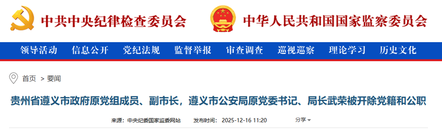 12月16日,据贵州省纪委监委消息,贵州省遵义市政府原党组成员、副市长,遵义市公安局原党委书记、局长武荣被“双开”。